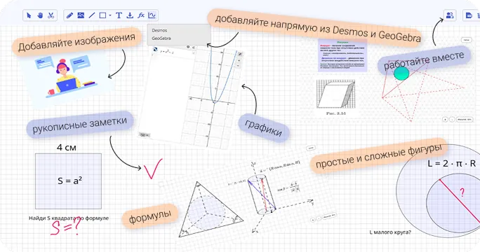 Вставлять интерактивные графики из Desmos и GeoGebra.