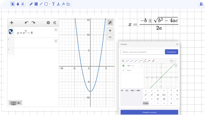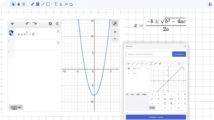 На доске можно не только писать, но и вставлять интерактивные графики из Desmos и GeoGebra, подставлять